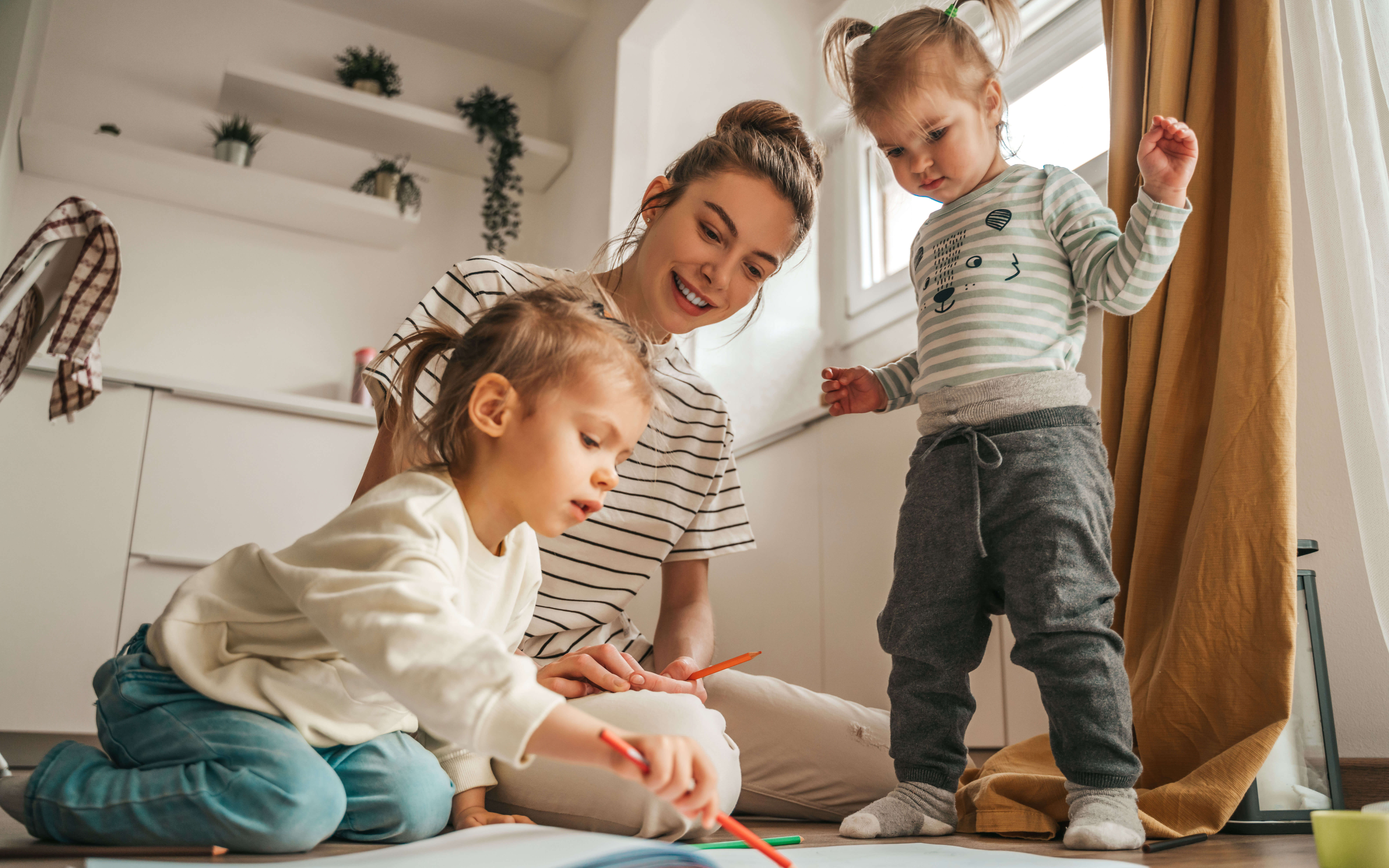 Child seated on the kitchen floor beside her mother and sister doodling with a colored pencil in the sketchbook