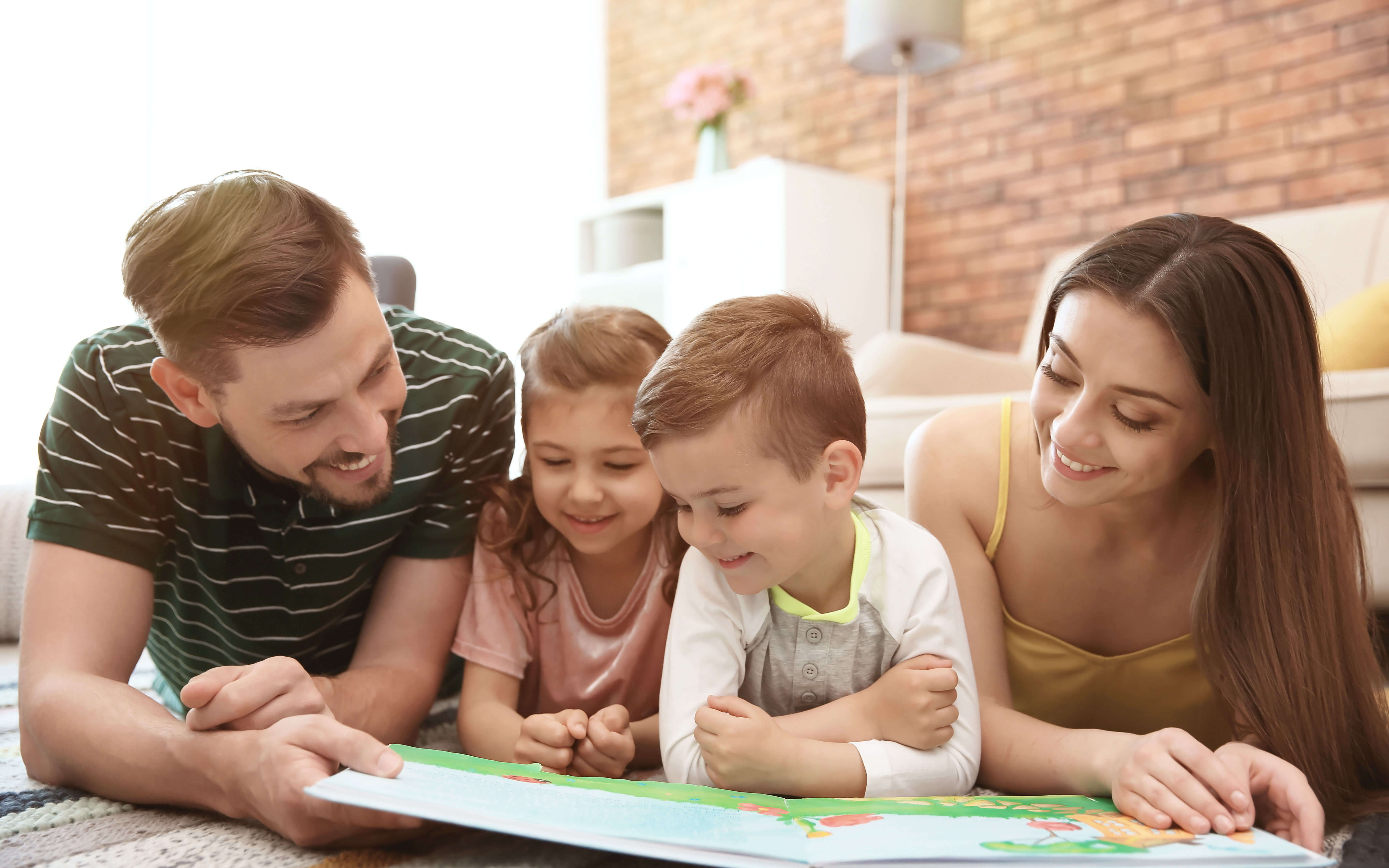Young couple reading book with children at home. Happy family